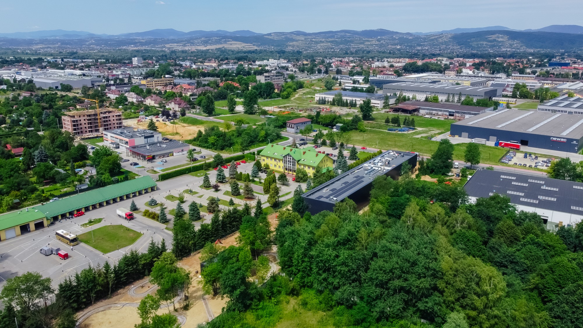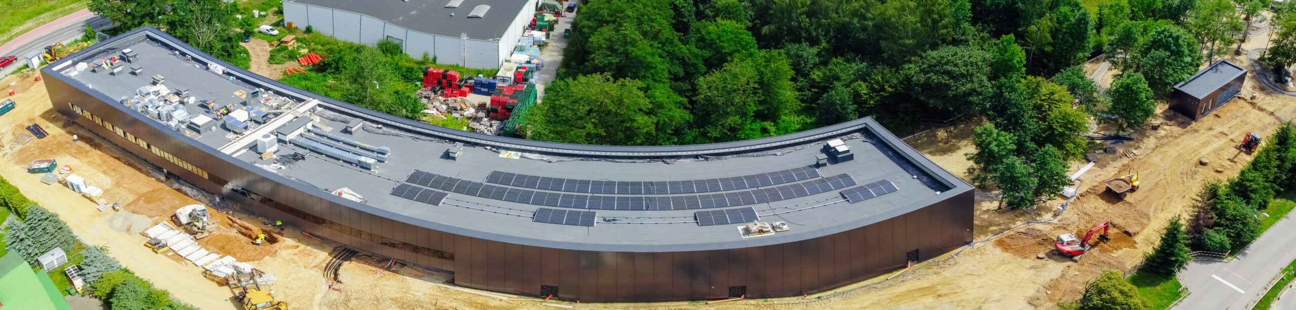 Realizacja nowej siedziby Archiwum Narodowego w Nowym Sączu to projekt o wyjątkowych wymaganiach technicznych, będący przykładem budownictwa pasywnego o dużej skali. Nasz zespół zapewnił precyzyjne wsparcie geodezyjne przy wytyczaniu fundamentów i osi konstrukcyjnych obiektu, który musi sprostać ogromnym obciążeniom przechowywanych dokumentów. Zakres prac objął bieżący monitoring geometryczny wznoszonych konstrukcji oraz precyzyjne pomiary pod montaż nowoczesnej elewacji i systemów klimatyzacji precyzyjnej. Wykorzystanie technologii dronów (widoczne na ujęciach DJI_0756-Pano) pozwoliło na regularne generowanie ortofotomap i monitoring postępu prac na całym placu budowy. Inwestycję zwieńczyła szczegółowa inwentaryzacja powykonawcza, dokumentująca wysoką jakość wykonania tego strategicznego obiektu użyteczności publicznej.