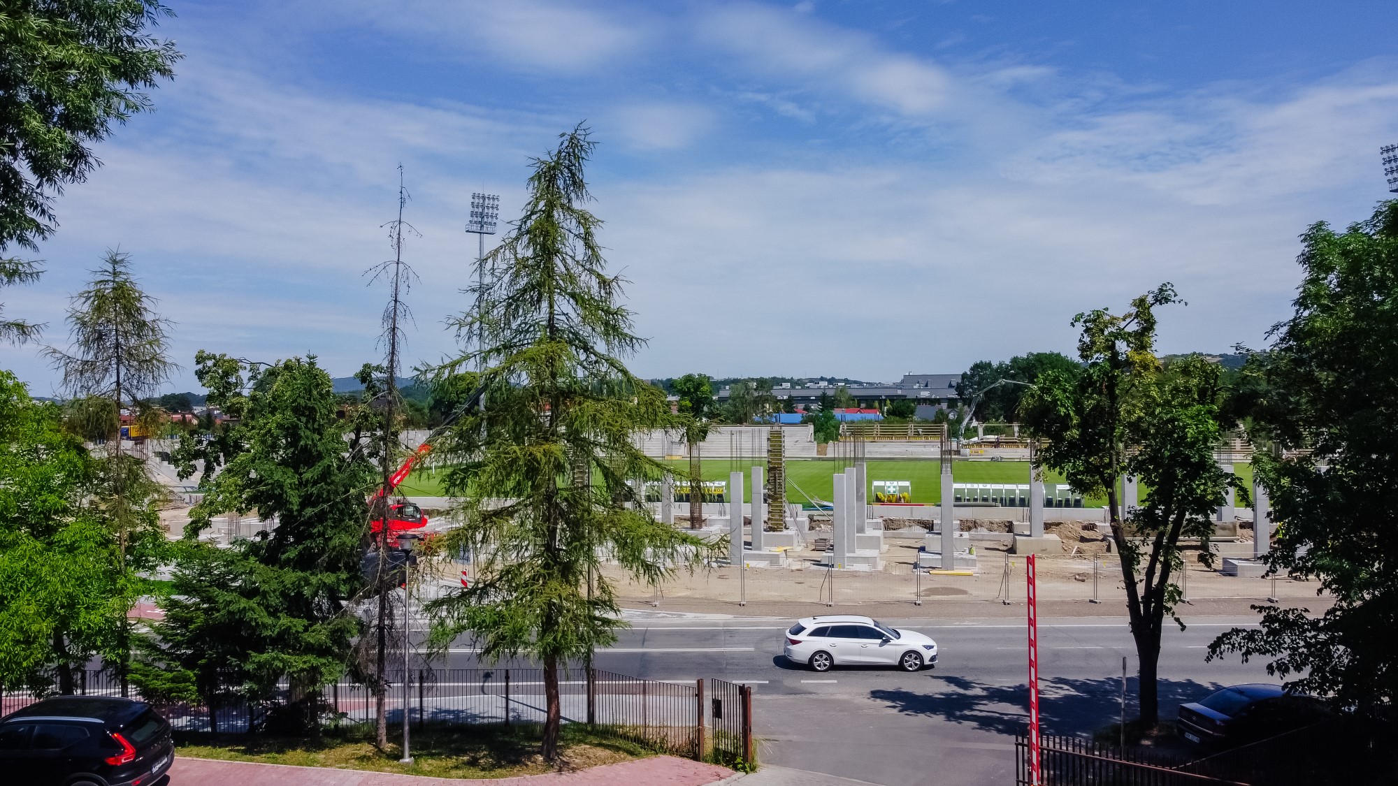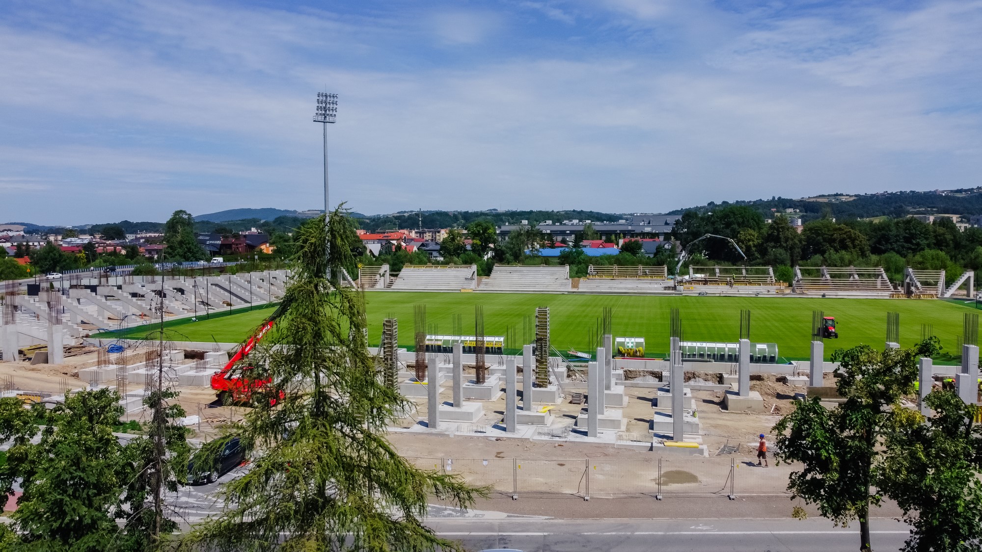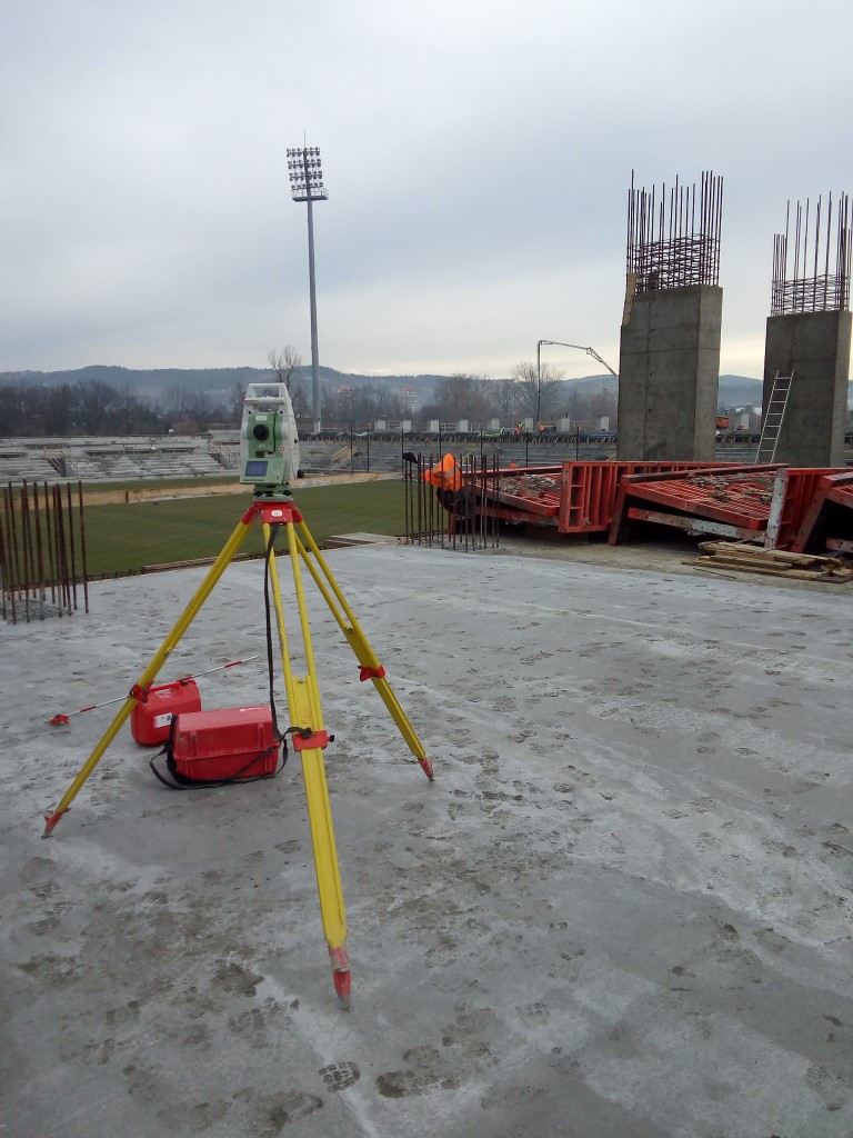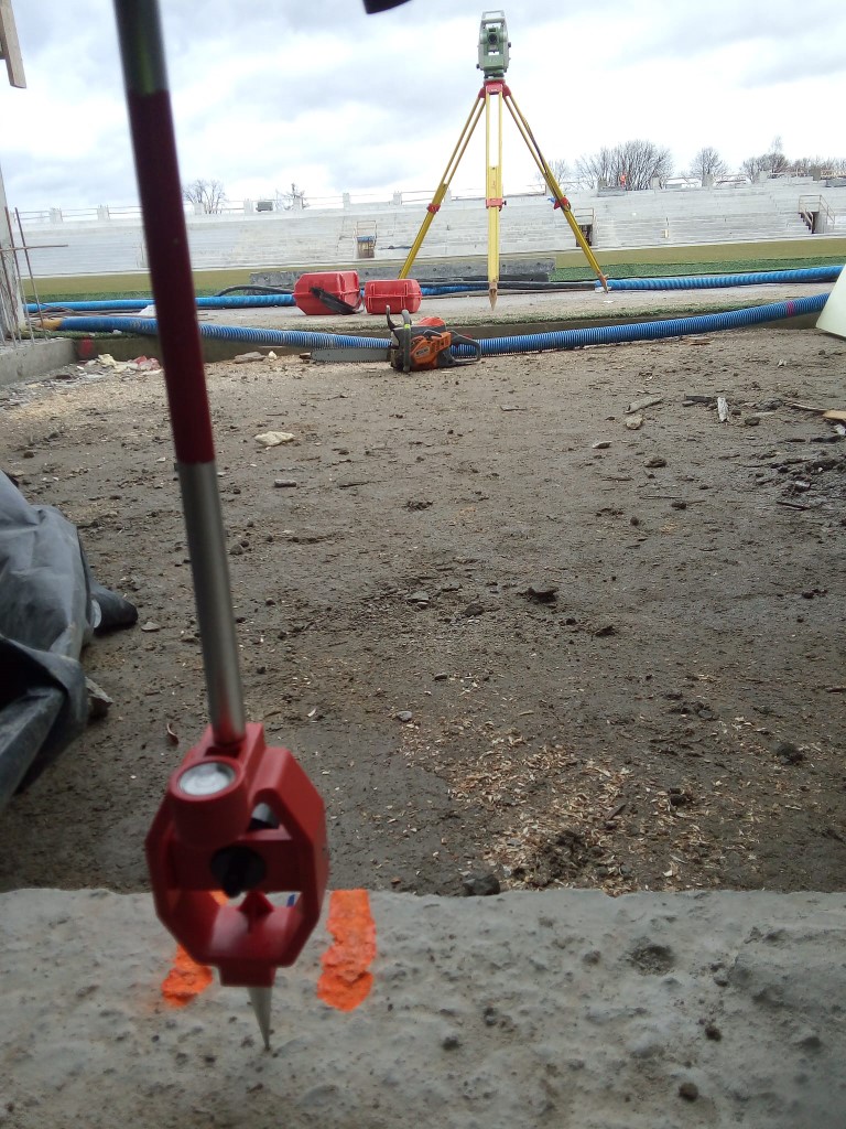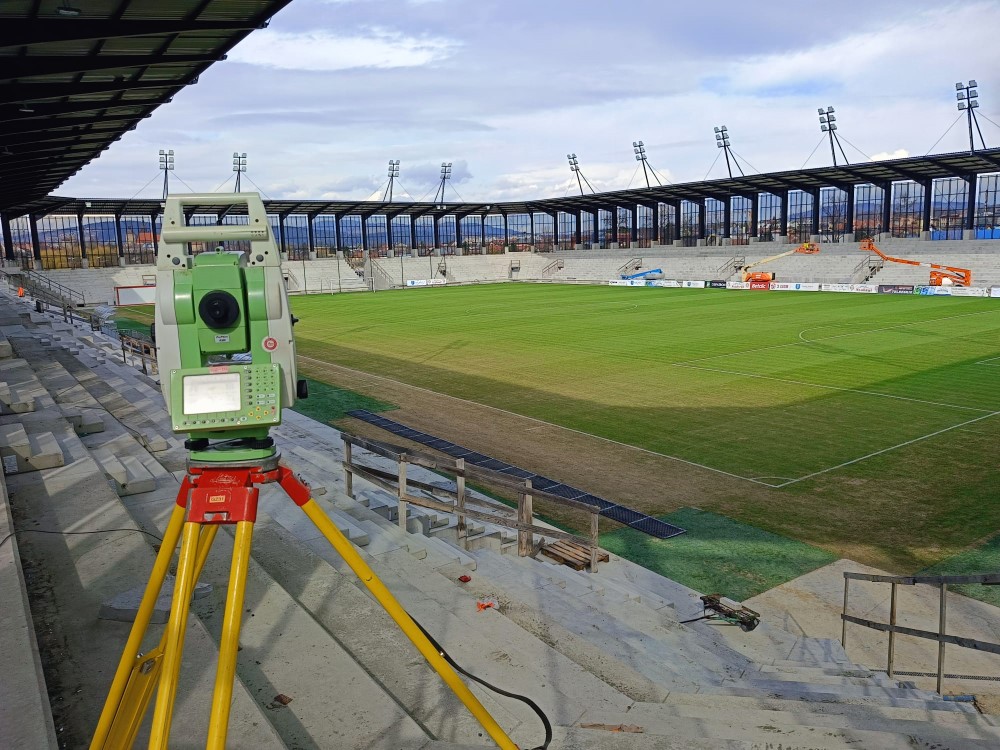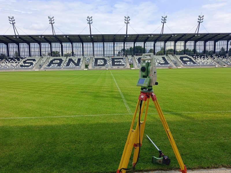 Realizacja stadionu miejskiego w Nowym Sączu wymagała od naszego zespołu precyzyjnego tyczenia skomplikowanej geometrii trybun oraz fundamentów pod maszty oświetleniowe. Nasze wsparcie geodezyjne objęło pełny cykl budowy – od precyzyjnego wytyczenia osi konstrukcyjnych obiektu, przez monitoring osiadań, aż po specjalistyczne pomiary przy profilowaniu płyty boiska pod systemy drenażu i ogrzewania murawy. Wykorzystanie floty dronów (widoczne na ujęciach DJI_0761 i DJI_0762) pozwoliło na bieżący monitoring postępu prac ziemnych i konstrukcyjnych, dostarczając inwestorowi rzetelnych ortofotomap całego placu budowy. Projekt zwieńczyliśmy kompleksową inwentaryzacją powykonawczą całej infrastruktury sportowej i technicznej.